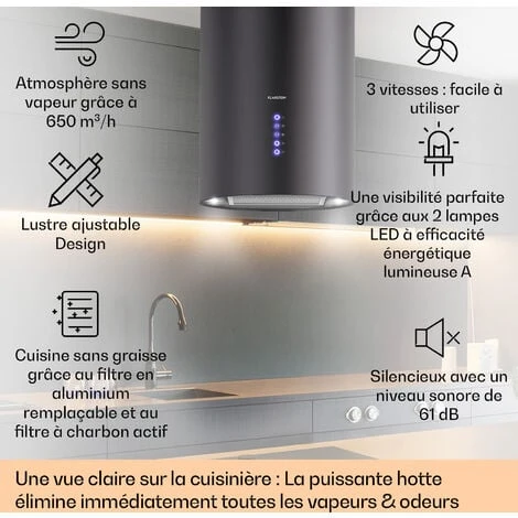 SANS GRAISSE, HUILE OU ODEURS : La superbe hotte ilot central Klarstein comprend 2 filtres à graisse en aluminium pour piéger la graisse, l’huile et la poussière, tandis que les filtres à charbon actif éliminent les odeurs et les vapeurs.