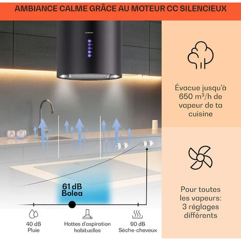 PUISSANTE ET FILTRE TOUTES LES VAPEURS : Avec 3 niveaux de puissance et un débit de 650m³/h, la hotte suspendue réduit les odeurs et filtre les vapeurs pour une meilleure qualité de l’air. Une minuterie éteint la hotte lorsque vous ne l’utilisez pas.