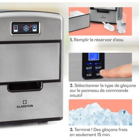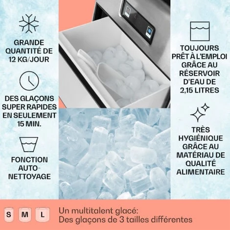 En 24 heures, la machine à glaçons Klarstein Metropolitan prépare jusqu’à 12 kg de glaçons et livre également régulièrement de nouveaux glaçons rafraîchissants pour les longues nuits de fête. Vous pouvez préparer jusqu’à 36 glaçons par heure et l’appareil n’a besoin que de 15 minutes environ pour préparer 9 glaçons. Remplissez tout simplement le réservoir de 2,15 litres avec de l’eau, choisissez la taille voulue des glaçons parmi les 3 disponibles, et c’est parti. Pour une répartition facile, le récipient peut être retiré avec la glace, mais une pelle pratique vous est également livrée.