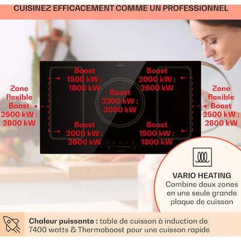 Chaleur puissante : Cinq zones de cuisson de 2300, 2 x 1500 & 2 x 2000 watts pour un total de 7400 watts