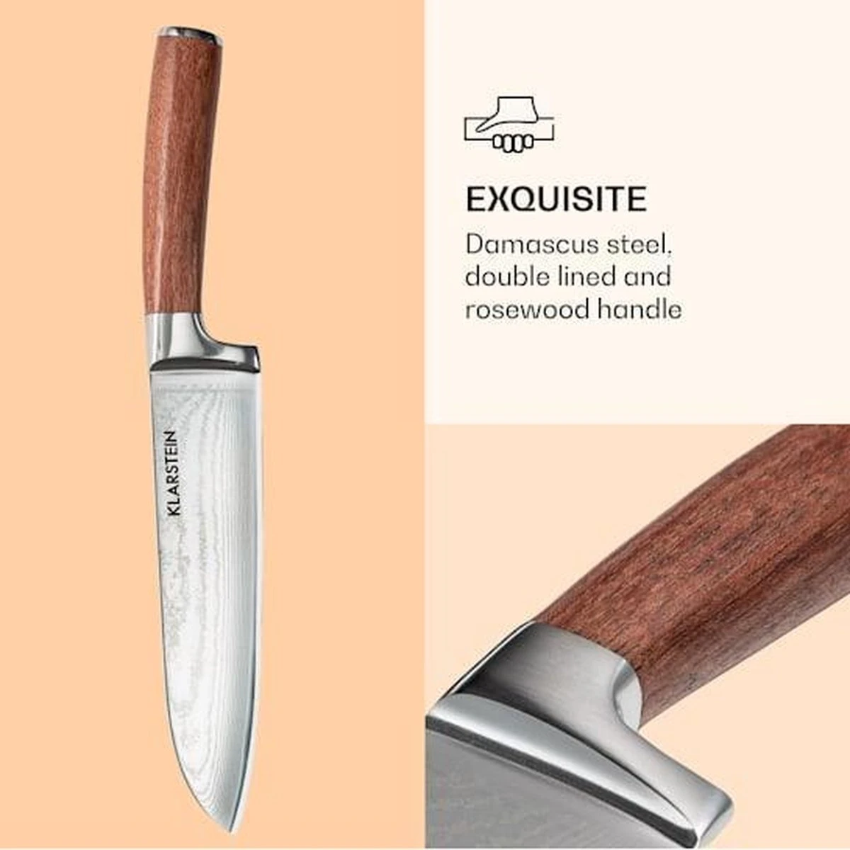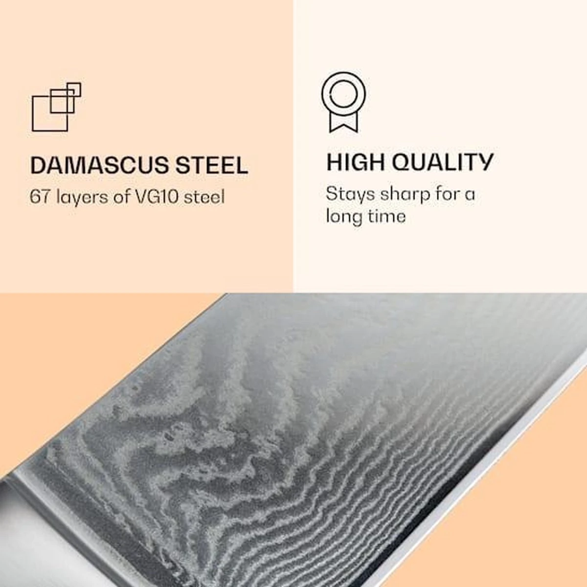Dans une tradition vieille de plus d’un siècle, l’acier Damas est créé, qui est forgé en un nieuw métal à partir de différents types d’acier. Cet alliage de la plus haute qualité rend le Klarstein Kaitodes couteaux exclusif, durable et solide. Les lames des couteaux sont constituées de 67 couches du meilleur acier et sont maintenues par un manche en bois de rose. Lescouteaux de qualité sont un achat à vie, les lames impressionnent par leurs arêtes vives qui durent longtemps, la finition miroir lui donne la touche finale.