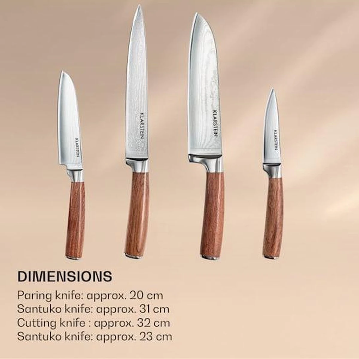 - Ensemble Noble 4: couteau Santoku 7″, couteau Santoku 5″, couteau d’office 3,5″, couteau de chef 8″