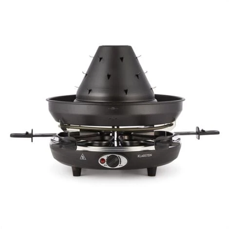 Le grill de table 2-en-1 Klarstein Taste Volcano vous révèle le vrai goût des aliments grâce au revêtement antiadhésif de son chapeau tatare. Viande, poisson, fruits de mer, ou légumes, cette fois jusqu’à 6 participants en auront pour leur argent et pourront à loisir piquer leurs aliments sur les crochets. Pendant que ceux-ci grésillent joyeusement sur le chapeau, d’autres délices cuisent dans leur jus dans les larges rebords du chapeau. C’est le moment de s’emparer de la galette de pain et de la tremper dans le jus de cuisson. Celui qui n’est pas d’humeur à manger grillé glisse un des 6 poêlons à raclette dans la caverne brûlante du Grill raclette Klarstein Taste Volcano. Là les 1500 W bouillonnent joyeusement et grillent les fromages qui se transforment en de délicieuses spécialités crémeuses à la croûte dorée. Bien sûr on peut toujours inventer de nouvelles façons de faire, et les combiner avec la viande, les légumes ou même les fruits, la limite à votre création n’étant que celle des ingrédients disponibles.