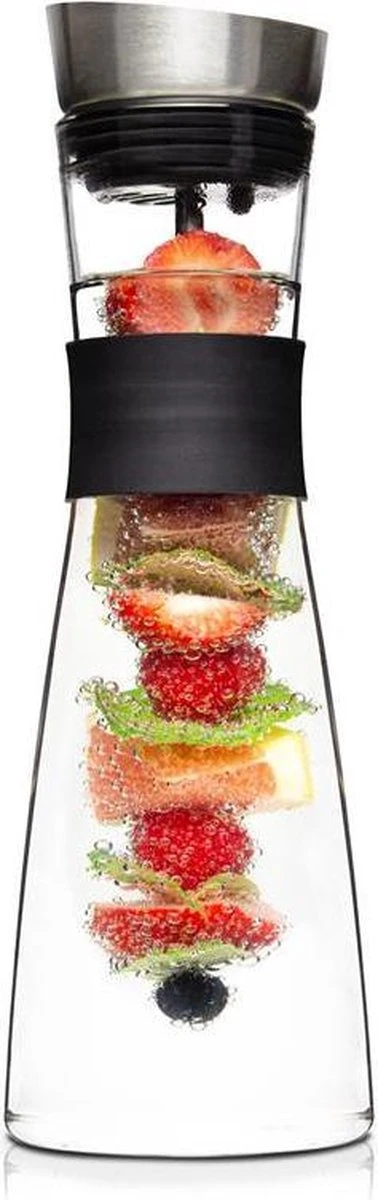 Parce que l’élégante carafe en verre convainc non seulement par son design particulièrement élégant, mais dispose également d’une brochette de fruits amovible. Vissez simplement la brochette dans le filetage du couvercle en acier inoxydable, piquez vos fruits préférés et placez le bouchon pratique. Les morceaux de fruits donnent à l’eau un goût délicieux et frais sans obstruer les choses lors du versement. Naturellement, la brochette peut être enlevée chaquecarafe peut être utilisé pour le thé chaud ou le thé glacé. Il n’y a Geen de problème dû à la fabrication du verre borosilicaté, qui est particulièrement résistant à la chaleur et au froid en raison de sa forte teneur en bore. L’anneau antidérapant en silicone qui protège vos mains lorsque vous servez des boissons chaudes ou froides assure également une prise en main stable.
